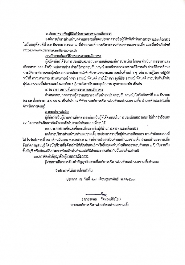 เปิดรับสมัครบุคคลเพื่อสรรหาและเลือกสรรเป็นพนักงานจ้างของ อบต.ด่านมะขามเตี้ย ประจำปีงบประมาณ พ.ศ.2569